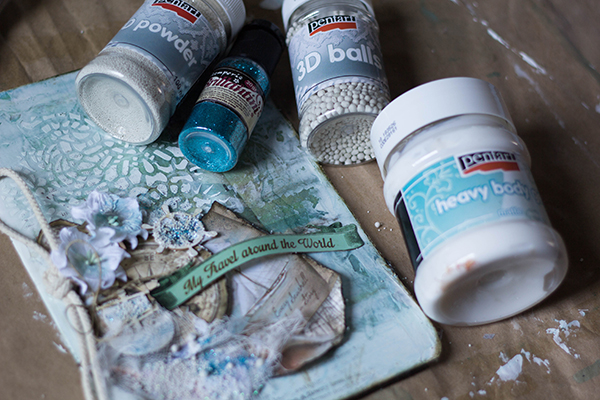 Ragasszunk a rétegezett papírokra a témához illeszkedő chipboard elemeket szintén a matt sűrű gélpasztával.